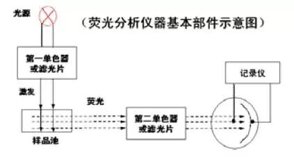 由光源发出的光通过切光器使其变成断续之光,通过激发光单色器变成单色光,此光即为荧光物质的激发光。被测的荧光物质在激发光照射下所发出的荧光,经过单色器变成单色荧光后照射于光电倍增管上,由其所发生的光电流经过放大器放大输至记录仪。一个激发,一个发射,采用双单色器系统,可分别测量激发光谱和荧光光谱。目前国内外荧光光谱仪示意图如图一: